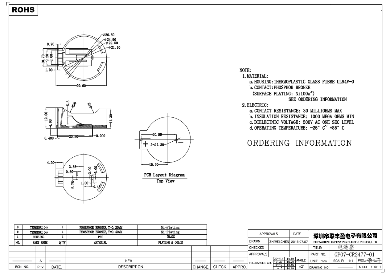 產品簡介品名:電池座產品型號:LFY07-CR2477-01電池型號:CR2477產品規格:DIP/插件式備注:黑色