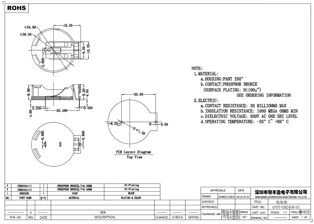 產品簡介品名:電池座產品型號:LFY07-CR2450-1電池型號:CR2450產品規格:DIP/插件式備注:黑色