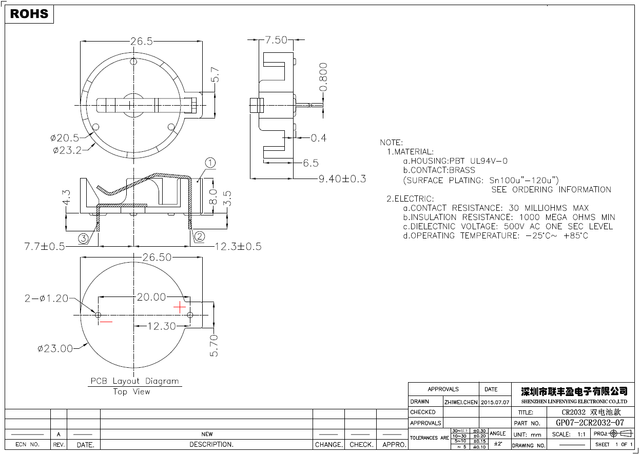 產品簡介品名:電池座產品型號:LFY07-2CR2032-07電池型號:CR2032,可裝雙電池產品規格:DIP/插件式備注:黑色