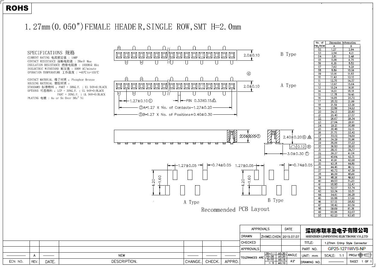 產品簡介品名:排母規格:貼片/立式180°間距:1.27mmPIN數:2-50PIN備注:排母系列